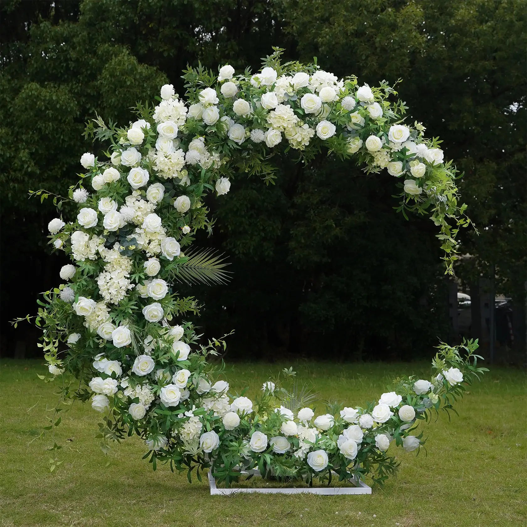 This White Moon-Shaped Artificial Floral Arch symbolizes completeness, unity, and the romantic journey of love under a shared destiny. The moon-shaped design reflects the cyclical nature of life and love, representing the couple’s promise to stand by each other through every phase. The pristine white florals embody purity, new beginnings, and a serene commitment to a harmonious future. This ethereal arch adds a touch of elegance and dreamlike beauty to the wedding, becoming a lasting symbol of their timeless bond and the luminous path they are about to walk together.